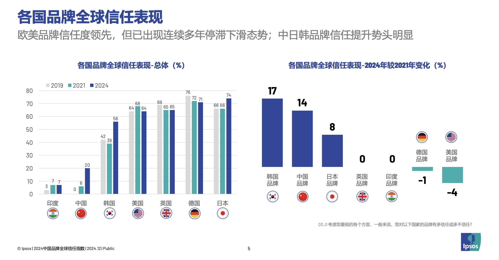 这是益普索对全球20个市场和1.6万名客户进行调查的结果。虽然欧美品牌在全球范围内从净信任度来看处于较高位置,但从趋势来看,欧美品牌的消费者信任度在过去五年中已经停滞或下降了很多年,相应地,中日韩品牌的信任度有了很强的提升势头。
