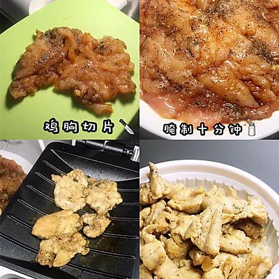 1、【黑胡椒炸鸡胸肉】鸡胸切成小块,加入极鲜腌制。 10 分分钟,撒上黑胡椒再放置。 5 分钟,三明治机预热一分钟,放入鸡肉煎烤,一分钟翻面起锅即可。