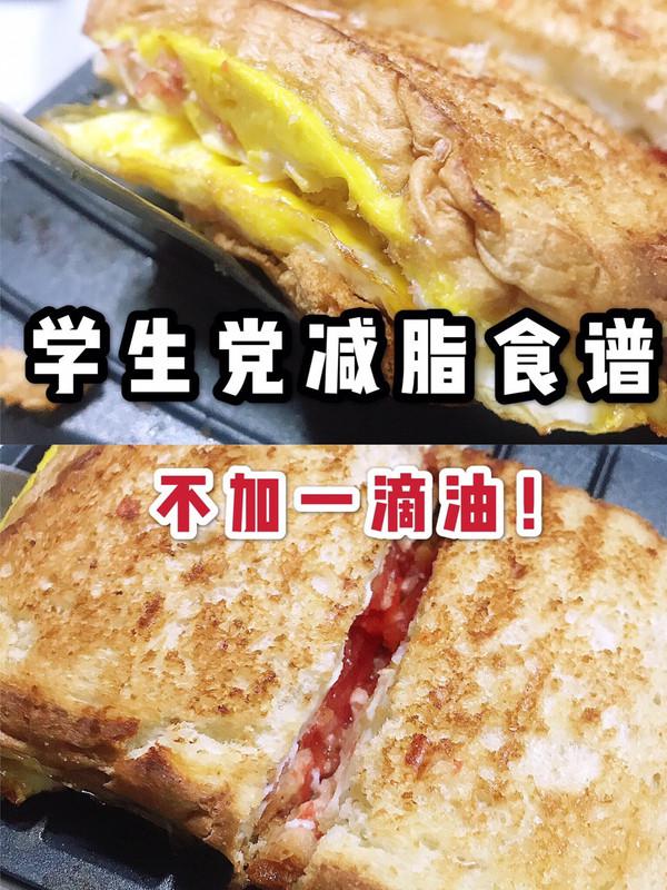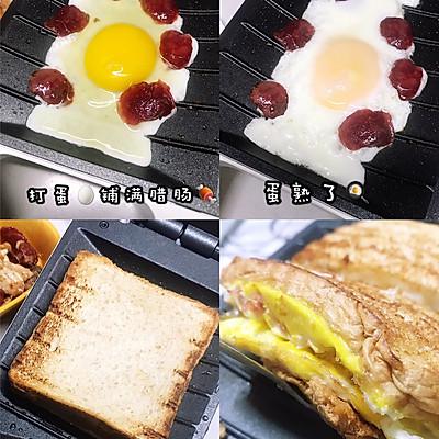 2、【减脂三明治】机器预热一分钟后,打入鸡蛋,将香肠切片撒在鸡蛋周围,在面包上涂抹适量黄油,同时将两块放入三明治烘烤,然后将煎蛋番茄片放入烤好的面包中,切成半块。