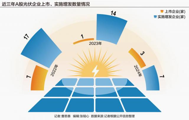 相较于 IPO,再融资阶段更能体现“退潮”的含义。据 21 结合世纪经济报道记者 Wind 数据分析,2022 年到 2024 年,A 股票光伏上市公司已实施增发的企业数量分别为 17 家、14 家、7 家庭,各自合计募资 413.65 亿元、319.11 亿元、90.74 亿元,增发募集资金持续下降。