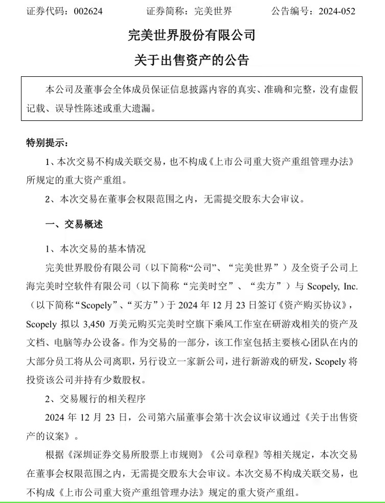 DoNews12月24日消息,完美世界今日发布公告,公司和全资子公司的完美时空和完美 Scopely 于 2024 年 12 月 23 每天签订《资产购买协议》,Scopely 拟以 3450 万美金(约 2.52 亿元)购买完美时空旗下乘风工作室在游戏相关资产、文件、计算机等办公用品(“标的资产”)。