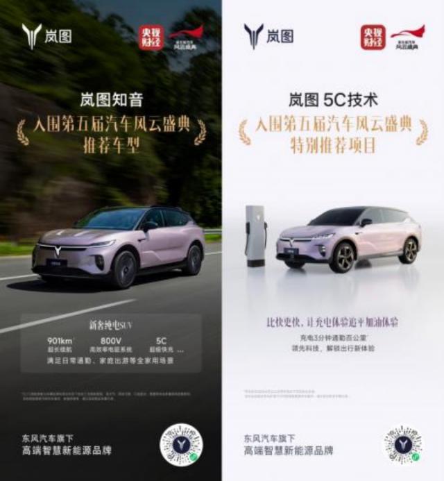 12 月 22 日,由中央广播电视总台主办、总台财经节目中心特别策划的第五届“汽车风云盛典”发布仪式在江苏盐城举行。经过市场选择和专家评估,推荐。 31 款式入选车型及 9 一个强烈推荐的入选项目。中国新能源汽车年度第一代表 1000 万台下线岚图知音,当选“第五届汽车风云盛典”入选车型";岚图知音搭载的 5C 超充电技术,充电 3 每分钟通勤100公里,当选“强烈推荐入选项目”,得到专家的一致好评。
