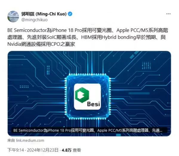 另外,郭明邈还表示,荷兰制造商贝思半导体将是 iPhone 18 Pro 实现可变光圈技术的关键部件是提供光圈叶片组装设备。与此同时,苹果也有望出现 iPhone 18 Pro 和 Pro Max 第一次使用台积电 2 尽管这会增加每一个Cpu的成本,纳米芯片 35 美元(约人民币) 254 元)测试,但是性能和能效的提高以及较小的芯片体积也会给用户带来更强的性能和更持久的电池寿命。