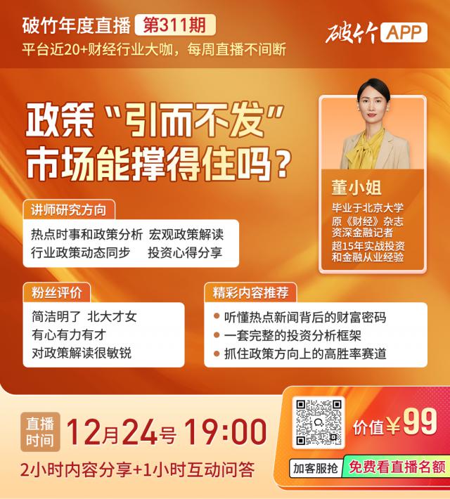 今晚 7 点击,在破竹直播间,我们邀请了大家熟悉的金融政策措施。大咖董小姐带给大家的“政策”不发”,市场能撑得住吗?主题直播。