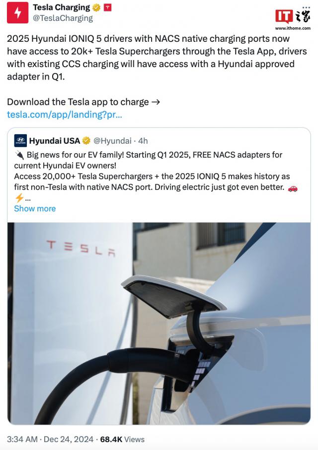 IT 世家 12 月 24 今天,现代汽车联合特斯拉宣布,现代将在 2025 第一季度(来年)开始向电动汽车客户免费发放。 NACS 规格充电适配器。这个免费适配器计划适用于 2025 年 1 月 31 日期或以前购买或租赁现代电动汽车的客户,“相关车主用户可以通过” My Hyundai " App 申请。