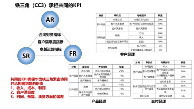 我们可以看到,类似于华为铁三角的组织(CC3),需要参与项目三个关键角色的考核指标体系,以便整个项目从线索到付款的联动。