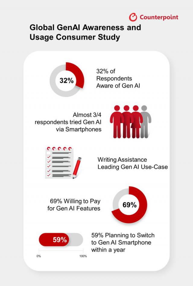 IT 世家 12 月 24 日消息,市场调查机构 Counterpoint Research 最近的调查显示,生成式 AI(Gen AI)智能手机市场格局正在迅速改变。消费者对 AI 功能性手机兴趣浓厚,尤其是美国市场,这预示着 Gen AI 移动电话的普及浪潮即将到来。