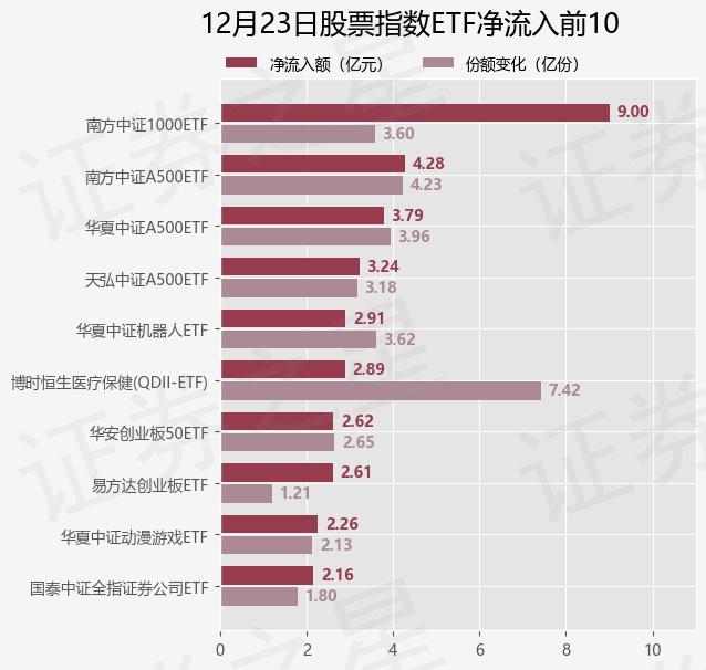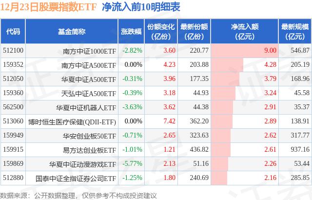 当天有 297 只股票指数 ETF 资金净流入出现在基金中,其中净流入排名第一的是南方中证 1000ETF(512100),增加了份额 3.6 十亿份,净流入额为 9.0 亿元。