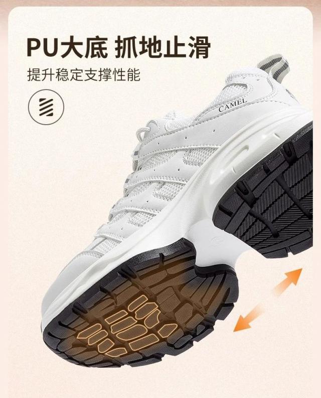 PU鞋底,上脚舒适轻便,抓地防滑,提高稳定支撑性能,雨季出行不跑偏,沾水也不会有怪响。