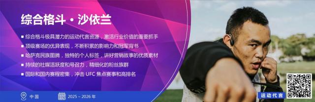 沙依兰是中国新一代综合格斗的代表,现阶段甚至未来很多年,UFC 中国拳手之一是赛场上最值得关注的。在赛场知名度的不断积累和加持下,哈萨克族的“格斗图腾”正在走出小众社区,进入中国综合格斗和体育商业的“主舞台”。伴随着综合格斗运动消费和观赛市场的迅速升温,沙依兰逐渐成为综合格斗类优质运动代言资源,值得品牌所关注。
