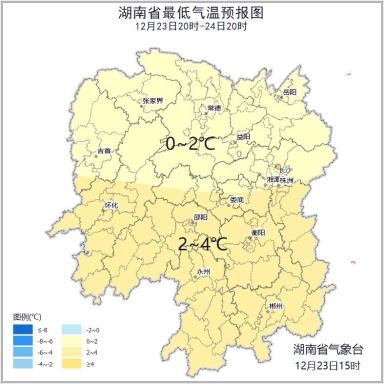 十二月二十三日晚至二十四日白天,全省多云间晴天;北风~三级;湘北最低温度0~2℃,其他地区2℃~4℃;湘南12的最高温度~14℃,湘西北7~9℃,其他地区10℃~12℃。