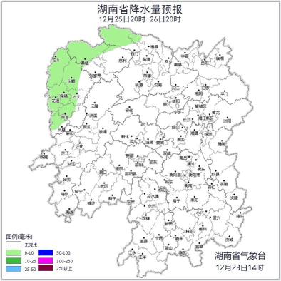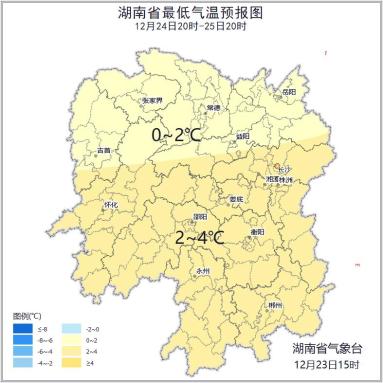 十二月二十四日晚至二十五日白天,全省阴天;北风~三级;湘北最低温度0~2℃,其他地区2℃~4℃;湘南15的最高温度~17℃,湘西北7~9℃,其他地区10℃~12℃。