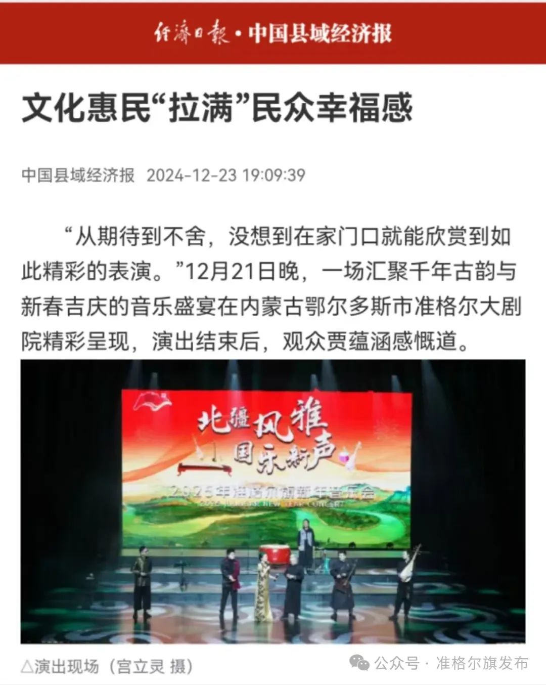十二月二十三日,中国县域经济报刊登了一篇文章《文化惠民“拉满”人民幸福感》,报道12月21日晚,准格尔大剧院开启了一场汇聚千年古韵和新年吉庆的音乐盛宴。今年,准格尔旗举办了新年阅读交响乐会、中国历代绘画大系准格尔旗特展、“中国经典阅读大会”(第二季)全国启动式、齐宝力高马头琴交响乐会,并出去参加了法国巴黎博览会、南“腔”北“调”、准格尔松阳文化交流互访等活动。一场高质量的艺术盛宴,一次又一次准格尔旗文化艺术的对外展示,强大地打响了北疆文化准格尔品牌。