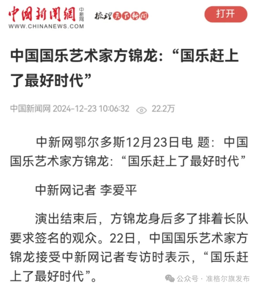 12月23日,中国新闻网发表了一篇文章《中国国乐艺术家方锦龙:“国乐赶上了最好的时代”。报道称,在《2025年准格尔旗新年文化惠民演出》中,方锦龙穿着长袍,满头银发,手里拿着一把五弦琵琶,指尖飞舞,拨弄着琴弦,给观众留下了深刻的印记。作为一名著名的国乐艺术家,方锦龙参观了50多个国家40多年,在国内外舞台上多次以多样化、创新化的方式呈现传统音乐的魅力。许多粉丝称他为“行走乐器库”和“方全会”。在接受中新网记者采访时,方锦龙表示,“国乐赶上了最佳时代”。