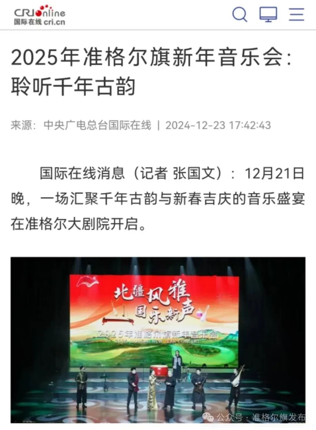 十二月二十三日,中央广播电视总台国际在线发表文章《2025年准格尔旗新年音乐会:倾听千年古韵》,报道12月21日晚,一场聚集千年古韵和新年吉庆的音乐盛宴在准格尔大剧院举行。今年,准格尔旗举办了新年阅读交响乐会、中国历代绘画大系准格尔旗特展、“中国经典阅读大会”(第二季)全国启动式、齐宝力高马头琴交响乐会,并出去参加了法国巴黎博览会、南“腔”北“调”、准格尔松阳文化交流互访等活动。一场高质量的艺术盛宴,一次又一次准格尔旗文化艺术的对外展示,强大地打响了北疆文化准格尔品牌。