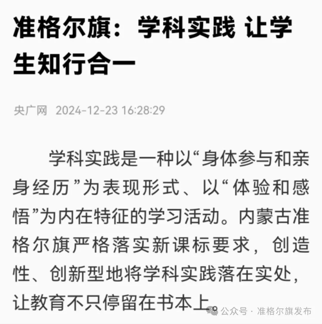 十二月二十三日,央广网首页发表文章《准格尔旗:学科实践》 报道准格尔旗通过学科实践创新丰富教学,唤起学生的创新意识,开发学生的创新潜力,使学生在实践过程中增强对学科知识的理解,有效促进学生知行合一,实现自身发展。