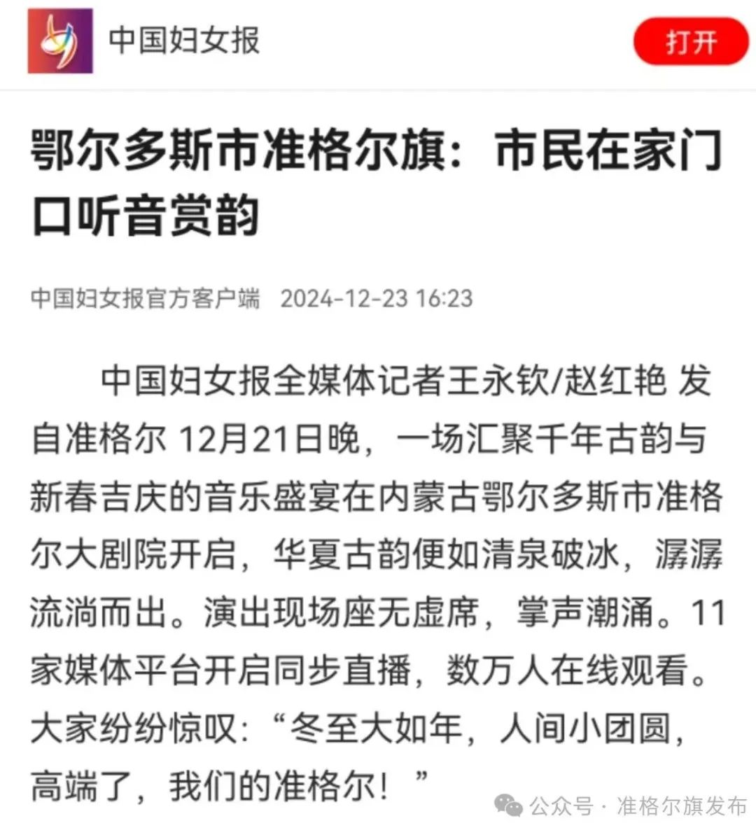 12月23日,《中国妇女报》、《中国县域经济报》、《中央广播网》、《中央广播电视总台国际在线》、《中国新闻网》等中央媒体聚焦准格尔旗,报道准格尔旗在家举办文化盛宴,让市民在家听声赏韵;准格尔旗以学科实践创新丰富教学,让学生知行合一;参加完《2025年准格尔旗新年文化惠民演出》后,在接受中新网记者采访时,中国国乐艺术家方锦龙表示,“国乐赶上了最佳时代”等内容。