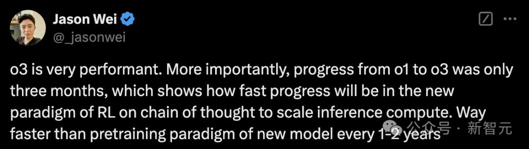 JasonOpenAI研究员 Wei表示,从o1到o3只用了3个月的时间,这表明在新范式下,每1-2年更新一次模型的速度比预训练范式要快得多。