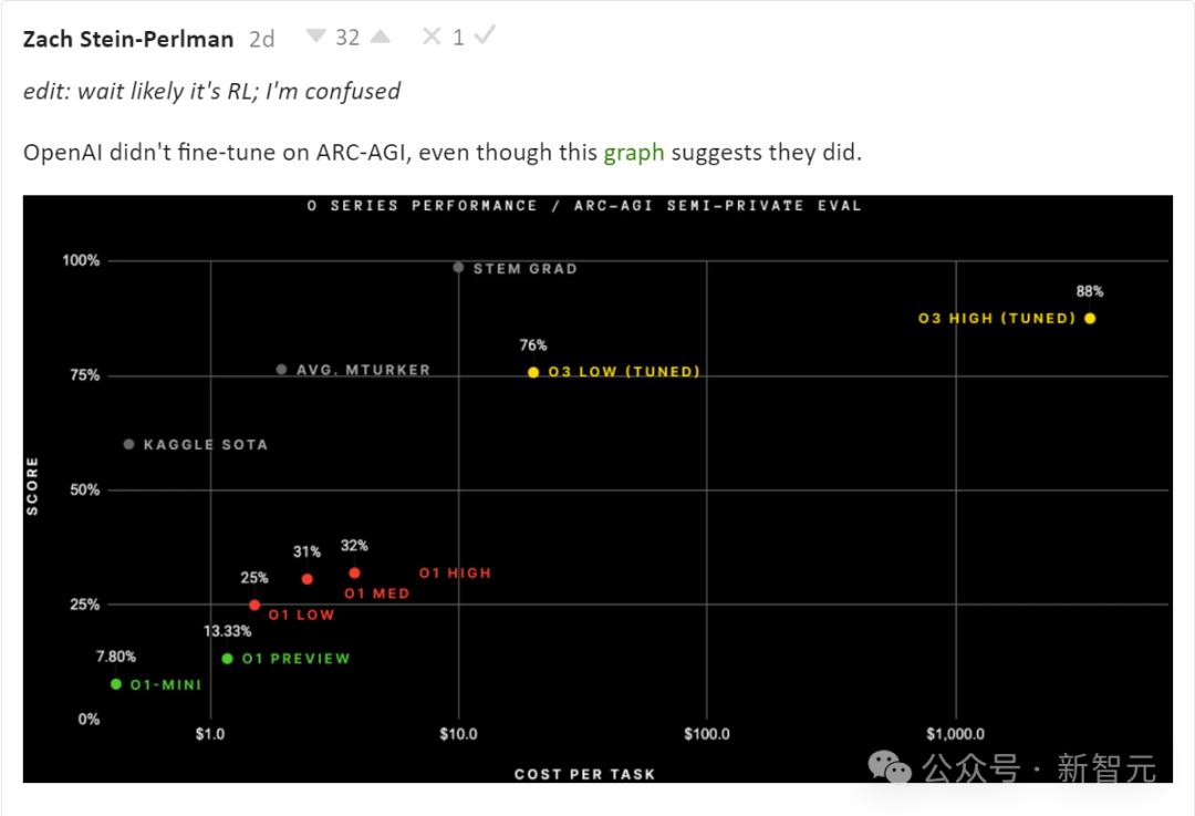 ZachOpenAI研究员 Stein-Perlman反驳说,他们没有对ARC的o3进行微调。