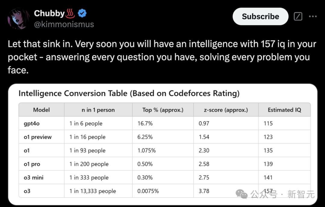 【导读】OpenAI o3的智商已经达到了157,99%的人类被压垮了?这个OpenAI模型的智力正在全网疯狂转变。甚至有人大胆预测,达到陶哲轩智力(225-230)的大模型应该很快就会出现。
