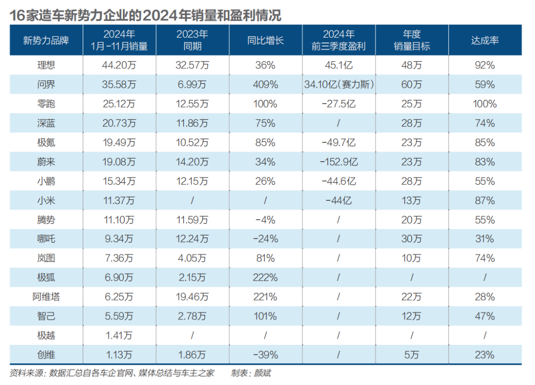 根据其整体销售业绩、盈利水平和销售目标达成情况,《财经》选择了16个主流新力量品牌进行对比分析。