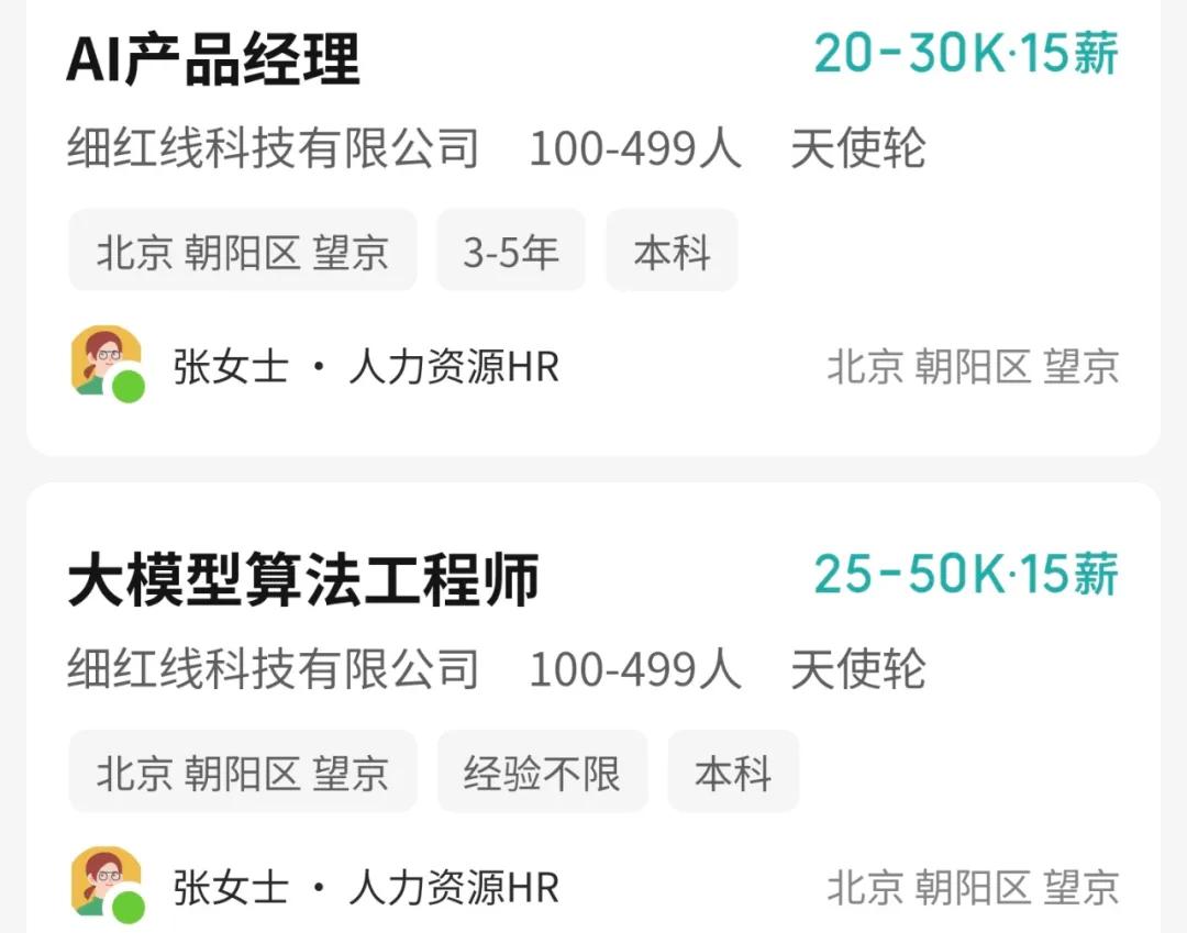 对于某些招聘软件,细红线科技公司已经在招聘AI相关岗位,如大型算法工程师、AI产品经理等。