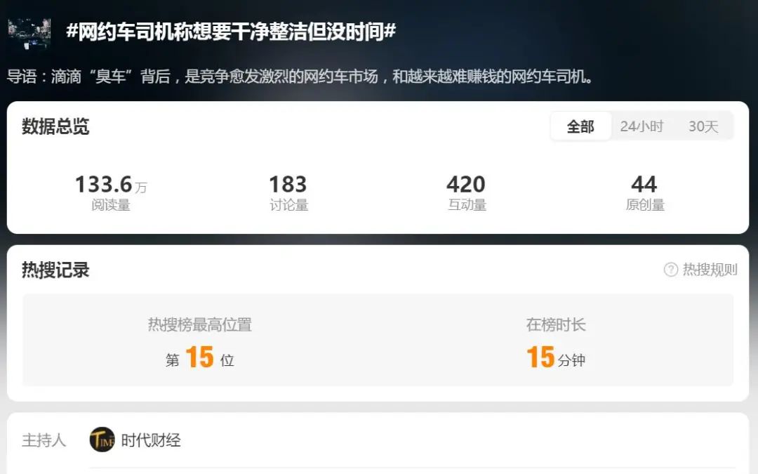 24日,由媒体主持的“网约车司机称想要干净整洁但没时间”的话题也冲上了热搜,媒体采访的网约车司机的回应,或许能代表一部分网约车群体的心声;