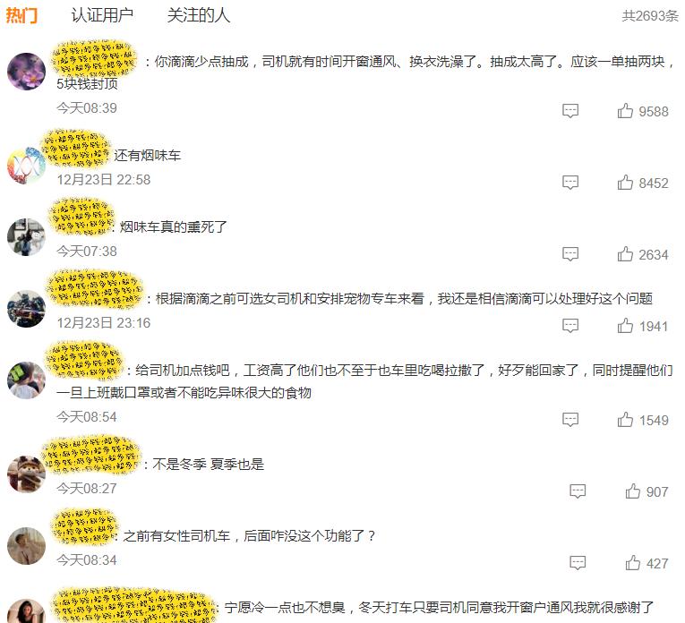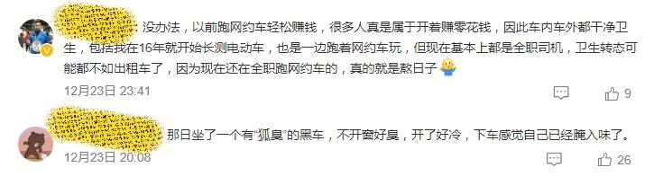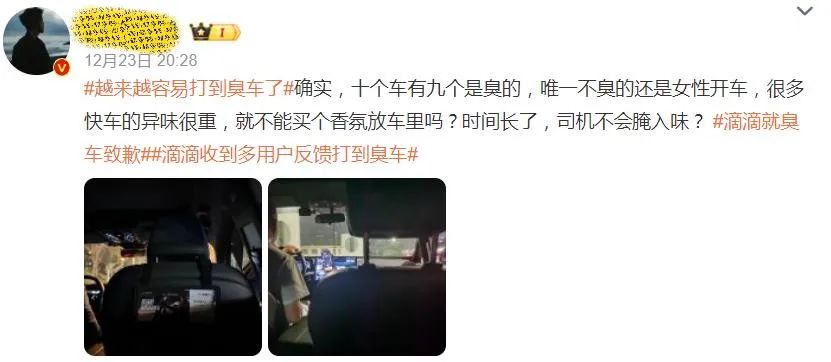 12月24日,“滴滴就臭车致歉”的话题同样冲上热搜,而在这两大话题的相关内容的评论区,来自五湖四海的网友的吐槽中,除了“臭味车”之外,还有对“烟味车”的排斥以及对女性司机车功能的呼唤……