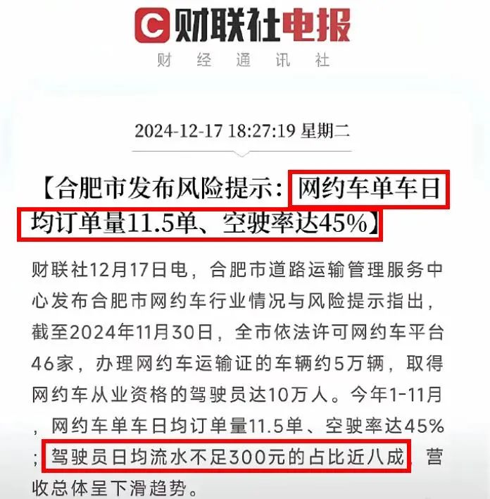 据《财联社》12月17日电报,合肥市发布风险提示:网约车单车日均订单量11.5单、空驶率达45%,驾驶员日均流水不到300元的占比近8成,营收整体呈下滑趋势;