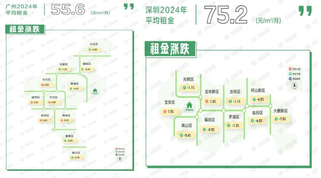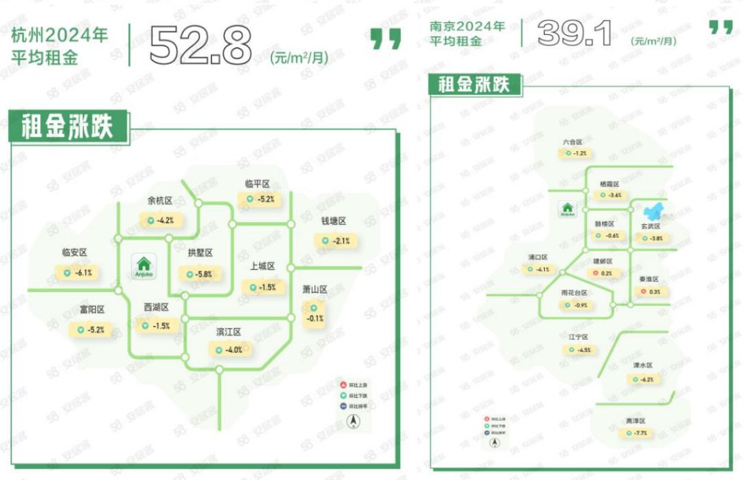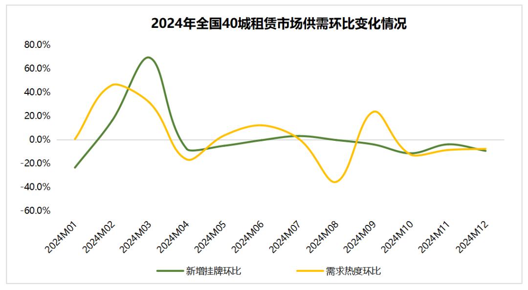 2024年,由于经济呈现弱复苏,整体租赁市场的活跃度有所下降。对比去年同期,今年市场新增租赁挂牌供应总量同比下降15.3%,线上租赁需求热度同比下降11.3%。在总量维度上,供需均呈现一定程度的收缩。