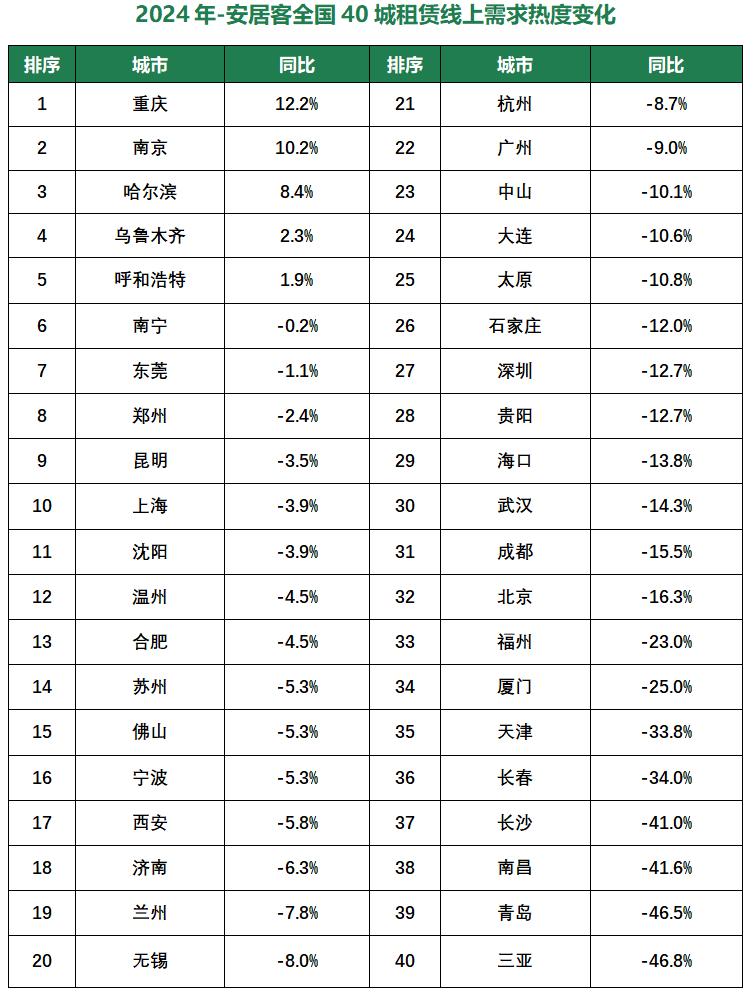 结合各城市线上需求热度变化来看,今年租赁需求热度同比增长的城市仅5个,包括重庆、南京、哈尔滨、乌鲁木齐及呼和浩特。同时,租赁需求热度同比跌幅超过10%的城市达到18个。可以看到,中西部核心城市需求热度表现相对较强,一方面基于城市人口基数较大,内生性租赁需求相对稳定;另一方面,中西部城市租赁价格相对较低,受到收入预期下降的影响相对更小。因此,去年租赁需求热度较高的城市今年普通回落显著,如北京、深圳、成都、武汉、长沙、三亚及青岛等。
