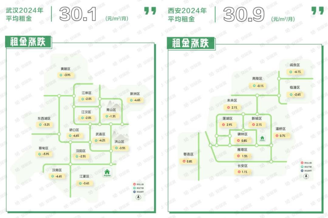 今年,重点10城价格表现差异较大。一方面,体现在城市挂牌价格的变动趋势分化;另一方面,城市区域的涨跌分布也呈现一定分化。整体来看,上海、广州、成都和西安的区域挂牌价格表现较强,上涨的区域数量超过下跌的区域。如上海有12个区的挂牌价格呈现同比上涨,成都和西安则达到8个。今年,核心区域挂牌价格表现更强的趋势显著。如北京的东城区和西城区逆势上涨4.9%、4%;成都的青羊、武侯、锦江和金牛价格表现较好。同时,部分城市由于受到流动人口变化的影响较大,呈现出供需活跃度较高的区域挂牌价格表现更强,如深圳的宝安和龙华,在城市租金下行的情况下,区域挂牌价格保持稳定。西安的莲湖、新城和未央的挂牌价格同比上涨均超过2%。