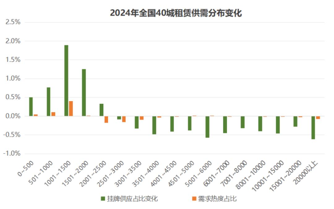 对比2023年租赁市场的价格供需分布来看,2024年由于收入预期的下降,中低价格房源的供需占比小幅上升,市场呈现供需价格中枢下降的趋势。结合全国40城价格供需变化,2500元/月/套以下房源供占比显著上升4.8%,而2500元/月/套以上各价格段的房源供应占比均小幅下降。同时,租赁需求方面,仅1500元/月/套以下房源的需求热度小幅上升0.6%。1001-1500元/月/套房源的供需占比上升相对显著,分别上升1.9%、0.4%。整体而言,市场需求对比挂牌供应的价格中枢下降更显著,反应出受就业活跃度下降的影响,租客支付能力下降,租房更加看重性价比。