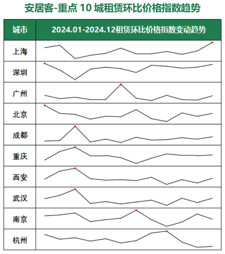 根据安居客的监测数据,今年重点10城的租赁市场价格走势呈现出明显的分化现象。一方面,各城市淡旺季租赁价格的波动规律性减弱,不再呈现出单一的旺季月份租赁价格一致性上升的趋势,城市间的独特性逐渐显现。各城市全年的价格高点差异较大。另一方面,二线城市在经历了去年租赁价格的强劲复苏后,今年的租赁价格走势弱于一线城市。