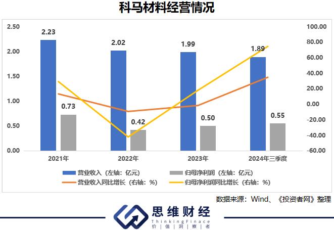 虽然科马材料在回复交易所问询时称,公司具备成长性。但从科马材料披露的业绩情况来看,公司的收入与利润却并未持续增长。2021年-2023年,科马材料的收入就呈现明显的下降趋势;虽然与2022年相比,2023年公司的净利润有所上涨,但仍不及2021年。