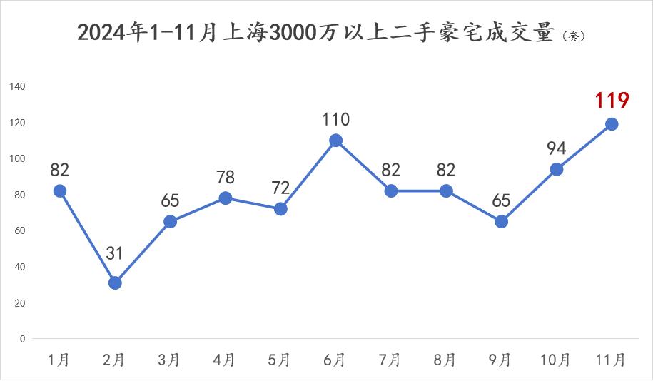 所以我们的筛选条件严格了一些,限定全市3000万以上豪宅。于是从900多个成交数据可以发现,二手豪宅全年成交量都创了新高,但越到年尾越疯狂。