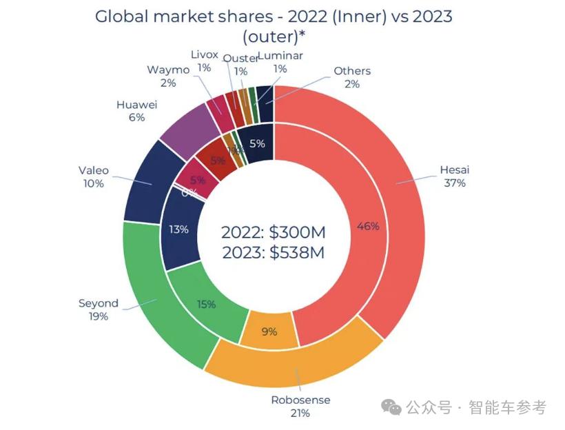 禾赛和速腾首当其冲,分别占据全球市场的37%和21%。