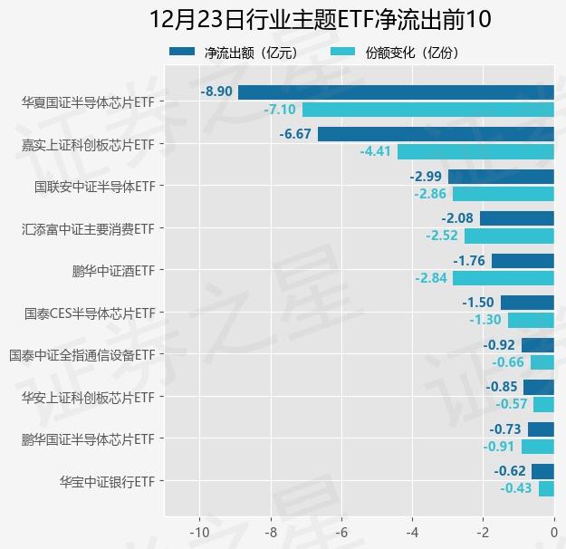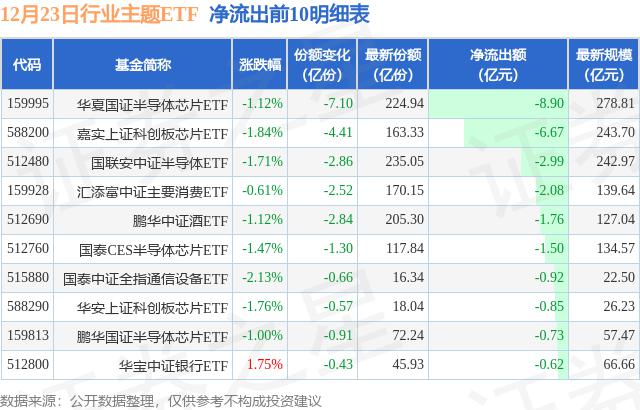 当天有 131 只行业主题 ETF 资金净流出,其中华夏国证半导体芯片净流出排名第一。 ETF(159995),份额下降 7.1 一亿份,净流出额为 8.9 亿元。