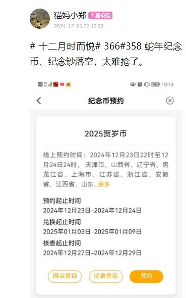 2025年贺岁纪念币于12月23日22时在线预约开通。22时30分,2025年贺岁钞在线预约开通。根据多家银行的公告,客户可以登录手机银行、门户网站、个人网银、微信微信官方账号进行预约,名额有限,金额已满。
