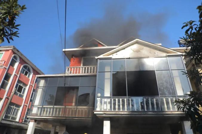从户外可以看出,待拆房屋的门窗玻璃已经被拆除,成为黑烟“逃逸”的“烟囱”。短短三分钟,整个房子都被黑烟笼罩着。即使戴着口罩,也能在现场闻到一股强烈的橡胶烧焦的刺鼻气味。