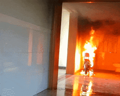 这个实验模拟了停在室内楼梯上的电动自行车,因为锂电池太热而起火。实验开始后,我们可以先看到黑烟从电池仓里冒出来,火焰瞬间包裹着车身,开始猛烈燃烧。