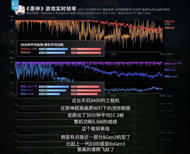 天玑在《原神》的检测中 8400 表现很好,30 稳定输出分钟内 57.3 帧,整机功耗仅为 6.6W,这个结果甚至接近隔壁。 8 系旗舰,带来真正的跨级感受。与天玑相比 8300 和 8sG3 这是一个飞跃,简直不是一个维度的性能。