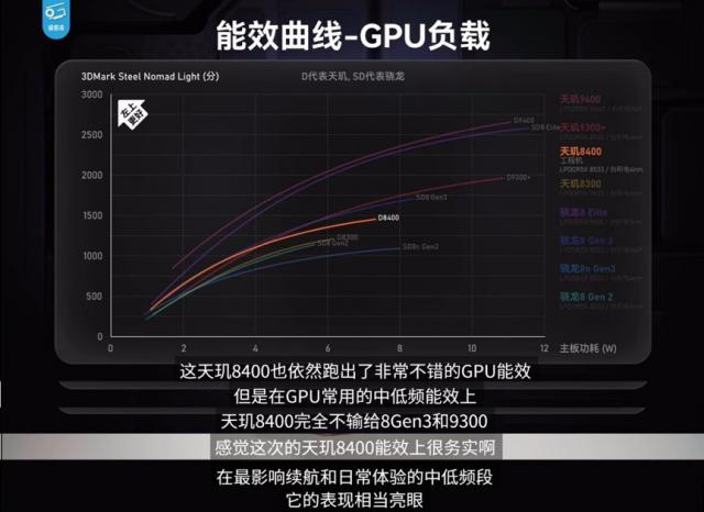 知名 UP 主极客湾对天玑也是如此 8400 实际测量,在影响续航和日常感受的中低频段,天玑 8400 的 GPU 表现完全不输同行,能效很务实。
