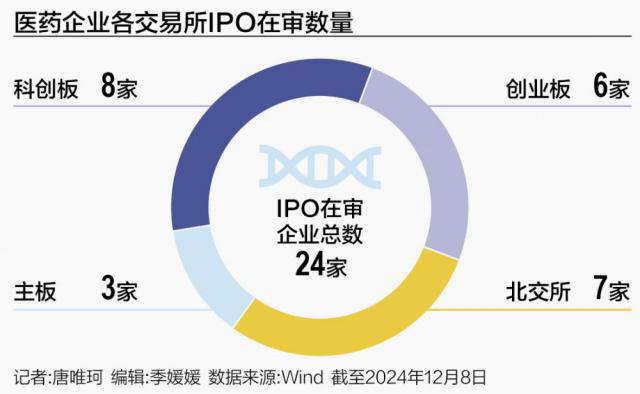 据记者不完全统计,A 股市场在 2024 整个年份都得到了 25 新股上市,医药板块只有医药板块 2 与去年同期相比,企业成功上市。 8 家大幅降低 75%。医药企业市场认可度明显下降,募集资金仅为 11.71 与去年同期相比,亿元 71.54 亿元减幅达 83.63%。这种现象提高了市场准入门槛,医药企业 IPO 困难的情况持续相关。仅上半年末,上半年沪深北三大交易所宣布终止审查的生物医药公司数量达到 35 家已经相当于去年的全年生物医药。 IPO 停止总和。也就是说,平均每一个 5 天空中有一家撤销 IPO。