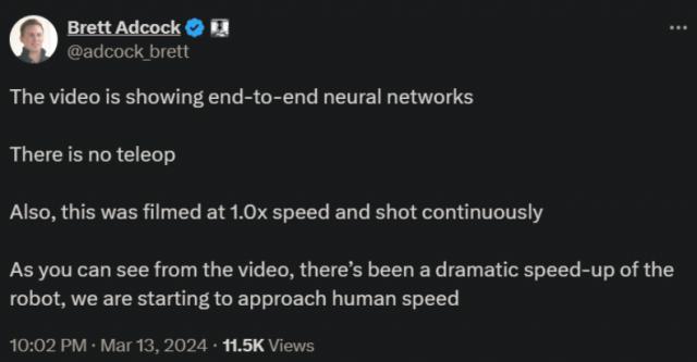 Figure 创始人 Brett Adcock 那时候说,视频里的 Figure 01 它显示了端到端神经网络框架下与人类的对话,没有任何远程控制。此外,机器人的速度明显提高,开始接近人类的速度。