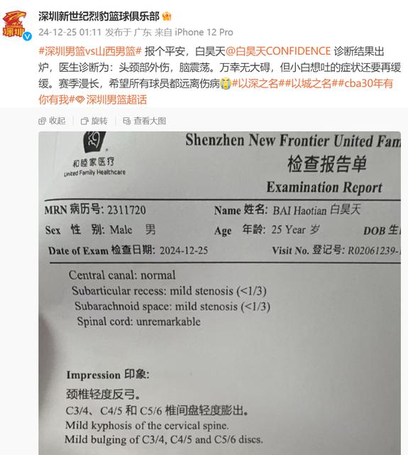 比赛结束后,白昊天第一次去医院检查。从检查结果来看,白昊天头颈部受伤,脑震荡。更重要的是,比赛结束后,白昊天感到疼痛、头晕和呕吐,这让人感到无助。