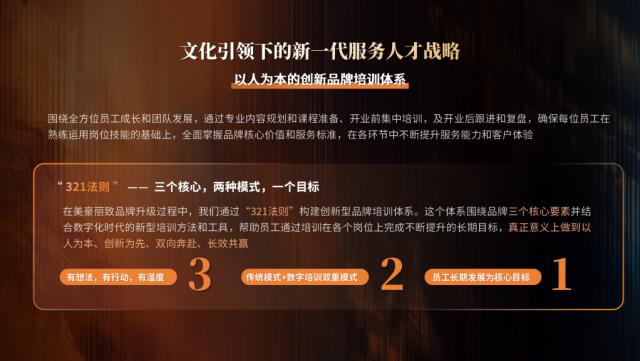 第二,“通过” 321 法则“构建创新的品牌培训体系。围绕全方位员工成长和团队发展,通过专业内容规划和课程准备、开业前集中培训、开业后跟进和重新审视,确保每个员工在熟练运用岗位技能的基础上,充分了解品牌核心价值和服务标准,不断提升服务能力和用户体验。在文化领导下打造新一代服务人才战略,巩固美豪华酒店发展所需的岗位胜任力和成熟完善的人才队伍。