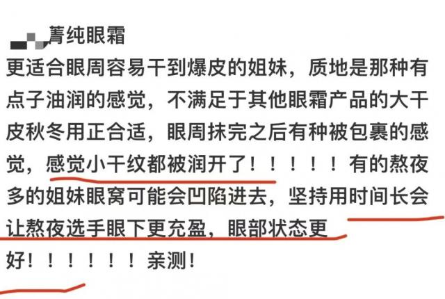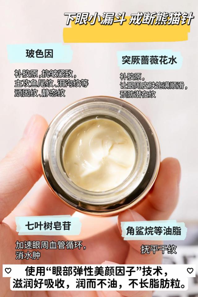原因是 ta 用到了“眼部弹性美颜因素”技术,膏状延展性比较好,皮肤感觉丝滑,有弹性。可以使成分进入皮肤,油脂在皮肤表面形成油膜。