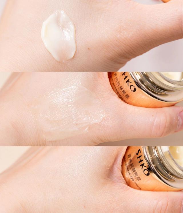 SHKO 添加到眼霜中的【角鲨烷,牛油果树果脂,向日葵籽油,泛醇】,给予足眼周围的保湿,让细纹无处可逃。