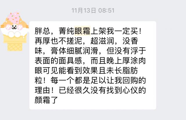 之所以不送眼霜样品,是因为原材料成本、生产线成本等问题,后续兜不住,所以眼霜样品后面不打算做,就做正装。
